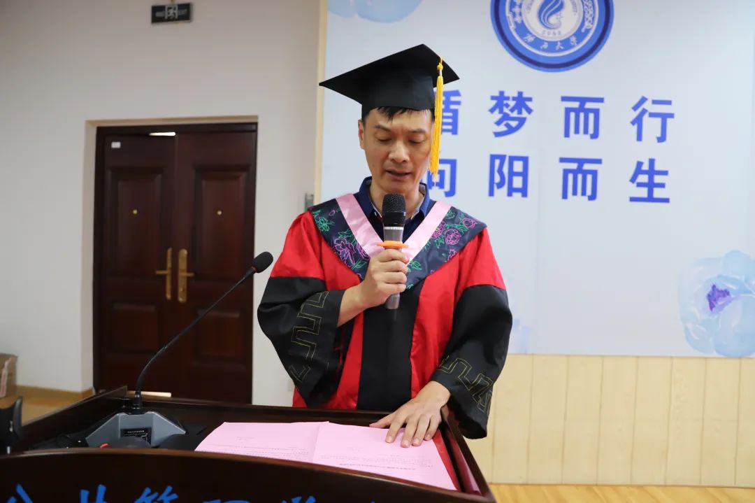副院长周均旭致辞并宣读学位授予决定,随后本科、学术型硕士毕业生按顺序依次上台接受学位授予。毕业班班主任老师为每一位上台的毕业生整理衣冠,聂鑫、史云贵为获得学位的毕业生行拨穗礼并授予学位证书,庞惠等老师与获得学位的毕业生握手、拥抱,祝贺其顺利毕业。