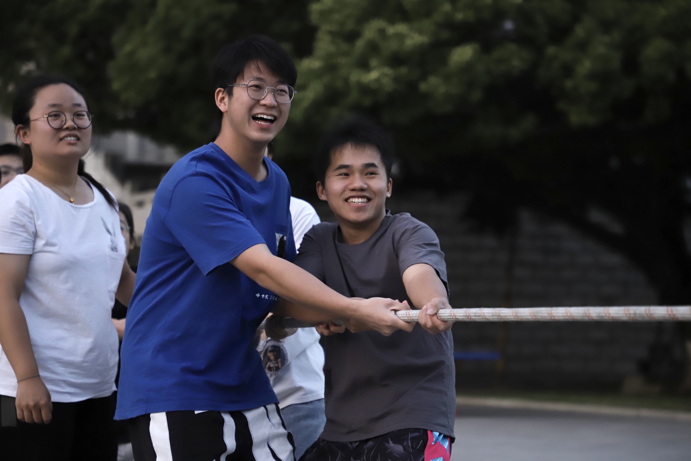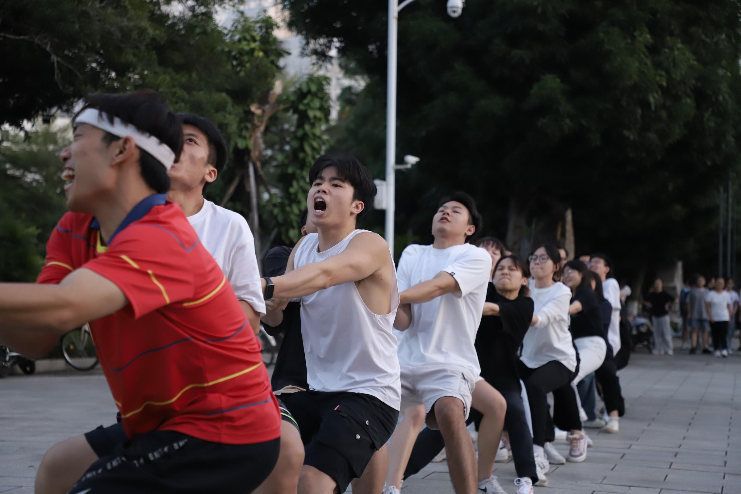 待到选手们戴好手套,站好队形,身子向后仰,脚弯成弓步,这场秋日里的激情对决正式拉开序幕。“3—2—1—嘀—”随着裁判吹响口哨,双方选手立刻卯足了劲,向后倒,往后拉,心往一处想,力往一处使。红绳在区间内来回移动,选手们在比赛中接受体力与意志力的考验。场边加油助威的同学们也不甘示弱,卖力的呐喊高呼汇成了轰轰烈烈的青春交响乐。