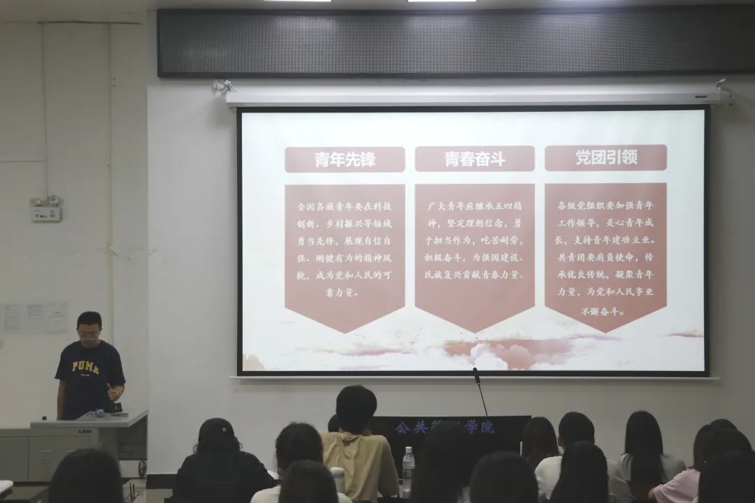 杨佳成以全国各领域青年的先进事迹作为模范典型,将青春模范事迹与公共管理学科实际相结合,鼓励约啪社区 学生坚定理想信念,提高自身政治站位,自觉做到“两个维护”,将小我融入大我,勇担民族复兴大任,同时要提升专业素养,扎根社会,服务人民,关注国家发展重点领域和关键环节,运用理论知识支持社会发展,在践行五四精神中,坚持守正创新,探索公共事业管理的新模式、新路径,为推进中国式现代化贡献青春力量。