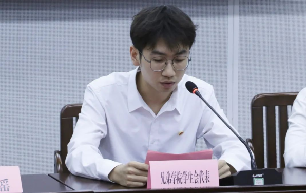 资源环境与材料学院学生会执行主席郭凯森代表兄弟学院学生会致辞。他对约啪社区 学生会工作取得成绩表示祝贺,希望两院学生会始终发扬精诚团结的合作精神,工作相互支持、共同发展,在交流中结下深厚友谊,携手共进,共建两院学生会的美好未来。