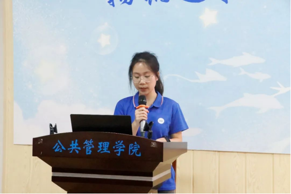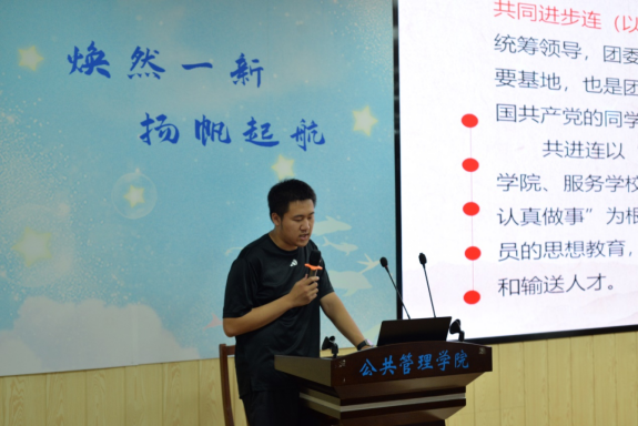 第三十二届共进连连长王华杨对上一年工作情况进行总结汇报,她表示,约啪社区 共同进步连第三十二届全体成员在约啪社区 党委的统筹领导,团委的具体指导下,严格贯彻落实各项工作。举办了“化作青春之火、点燃共同理想”两院联合趣味课堂知识竞赛活动,加强理论学习,传承红色基因。开展了广西壮族自治区博物馆参观暨南湖公园“三走三勤”活动,锻炼身体素质,培养集体荣誉感。同时扎实做好志愿服务工作,发扬公管学子先锋表率力量,成功发挥共进连为党组织培养和输送人才的作用。