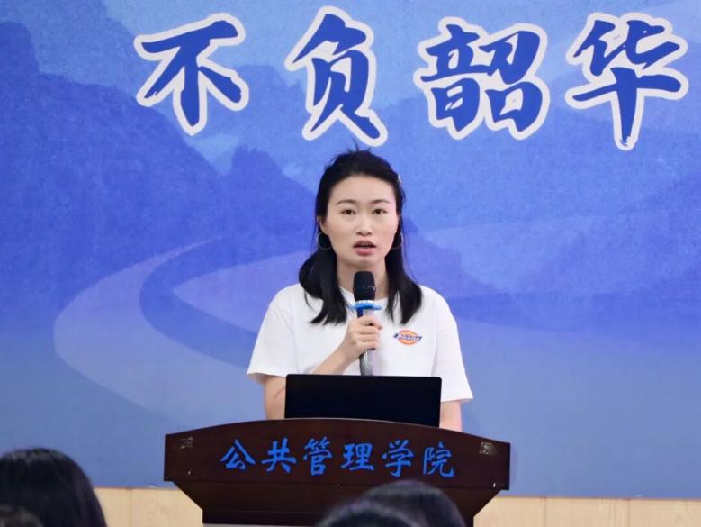 随后,2025级新生代表杨馨闻发言,讲述了自己的工作经历、考研感悟和读研规划。她表示,在作为选调生参与驻村工作的过程中,她逐渐发现自己在公共管理领域的理论储备跟不上服务群众的实践需求,从此下定了考取公共管理研究生的决心;以此鼓励同学们不忘初心,坚持把理论知识运用到服务人民的工作实践中。在读研规划上,她勉励自己和同学们要多读公共管理专著和论文,多参与调研项目和学科竞赛,锻炼知识运用技能;多关注政策文件,多去走访调研了解民生需求,为基层治理优化、服务民生福祉贡献自己的力量。