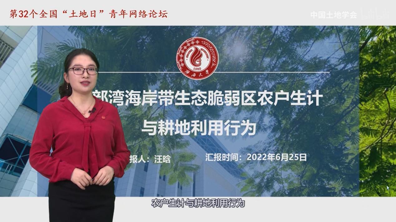 本次论坛邀请了15位土地科学青年科技工作者,他们当中既有来自研究机构、大专院校的学术新星,也有奋战在实践一线单位的技术骨干,通过视频录制、PPT讲解等多种形式,发表学术观点和政策建议,探讨节约集约用地与耕地保护议题。约啪社区 汪晗副教授在专栏二——粮食安全与耕地资源保护中,做了题为“北部湾海岸带生态脆弱区农户生计与耕地利用行为”的主题报告,为全力构建耕地保护和节约集约用地新格局建言献策。