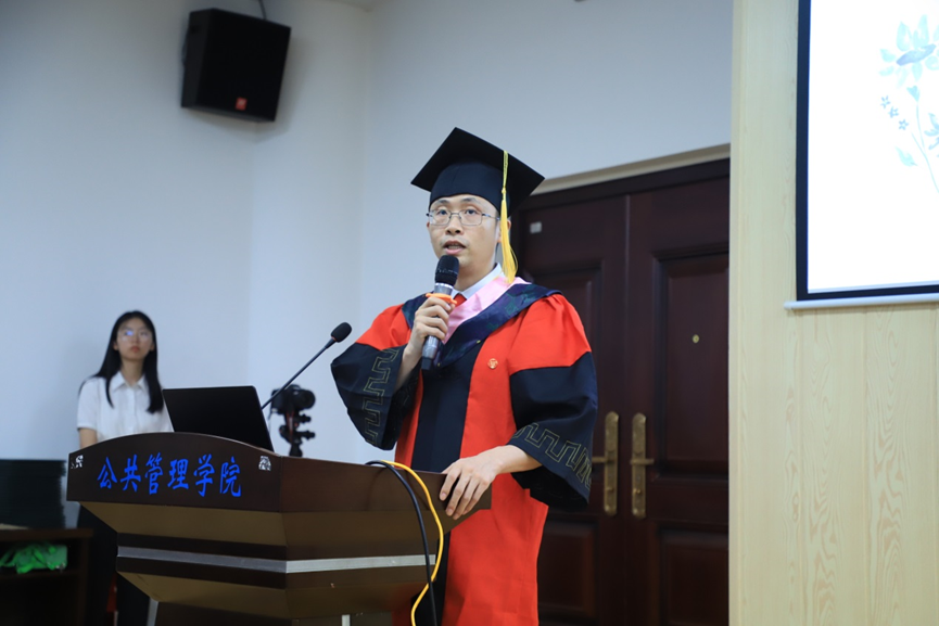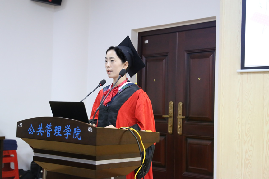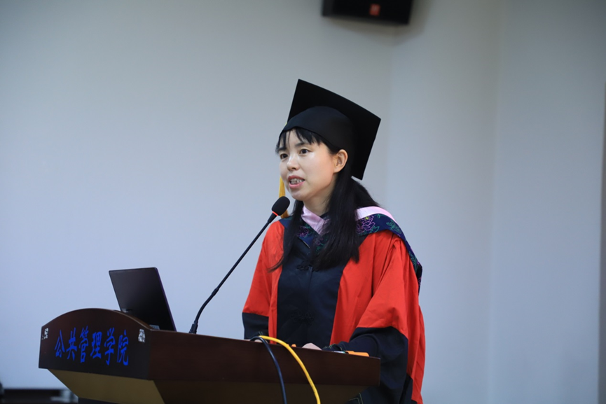 教师代表李小红副教授、学硕毕业生代表蒋文倩、专硕毕业生代表言天磊、本科生毕业生代表文颖、及在校生代表唐正昌上台发言。李小红首先向同学们道一声感谢,约啪社区 公共管理事业管理专业在2022年软科中国大学专业排名的提升离不开师生的共同努力。其次祝贺同学们顺利毕业,取得阶段性圆满。在进入下一阶段之前,可能会存在激动、期待、紧张和无措的情绪,但是希望大家能在当下细细回想老师、同学们的教导与陪伴,这些将会是你们不惧困难的力量。李小红以浙江大学高中山教授的经历告诉我们在学术追求的道路上,不应仅仅只有爱好和喜欢,更多的是要责任和担当。希望我们每个公管人在日后的工作和学习中,都能挑起重担,在面临困难时都能够坚持不懈。同时也欢迎同学们在想念母校的时候,能够常回母校看看,老师们也会想念大家。