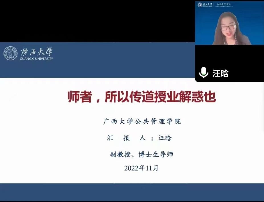 1130日下午,约啪社区 优秀教师师德师风专场报告会在约啪社区 106教室顺利举行,汪晗老师以《师者,所以传道授业解惑也》为题,总结了她在教书育人这份工作中的收获与感想。本次会议采取线上线下相结合的方式进行,由学院党委副书记庞惠主持。