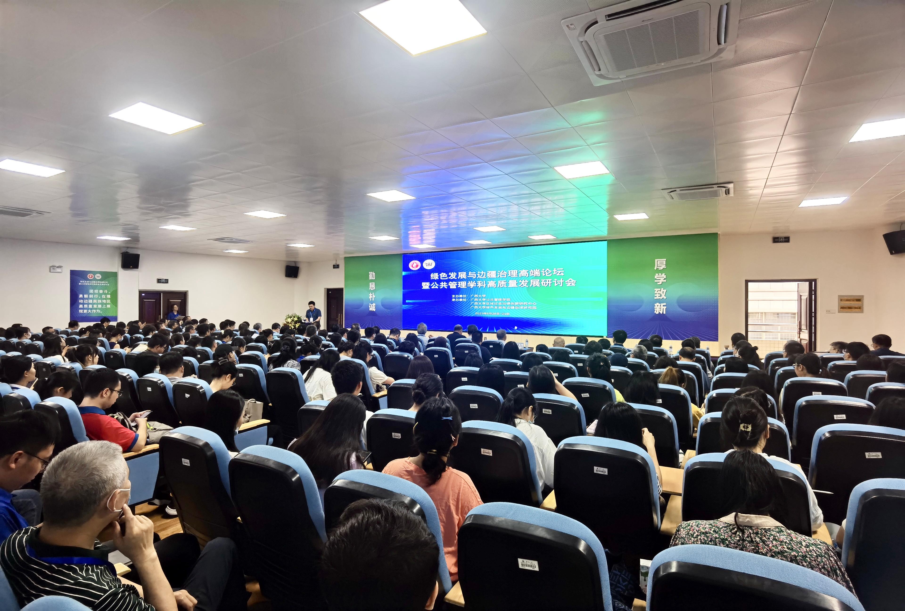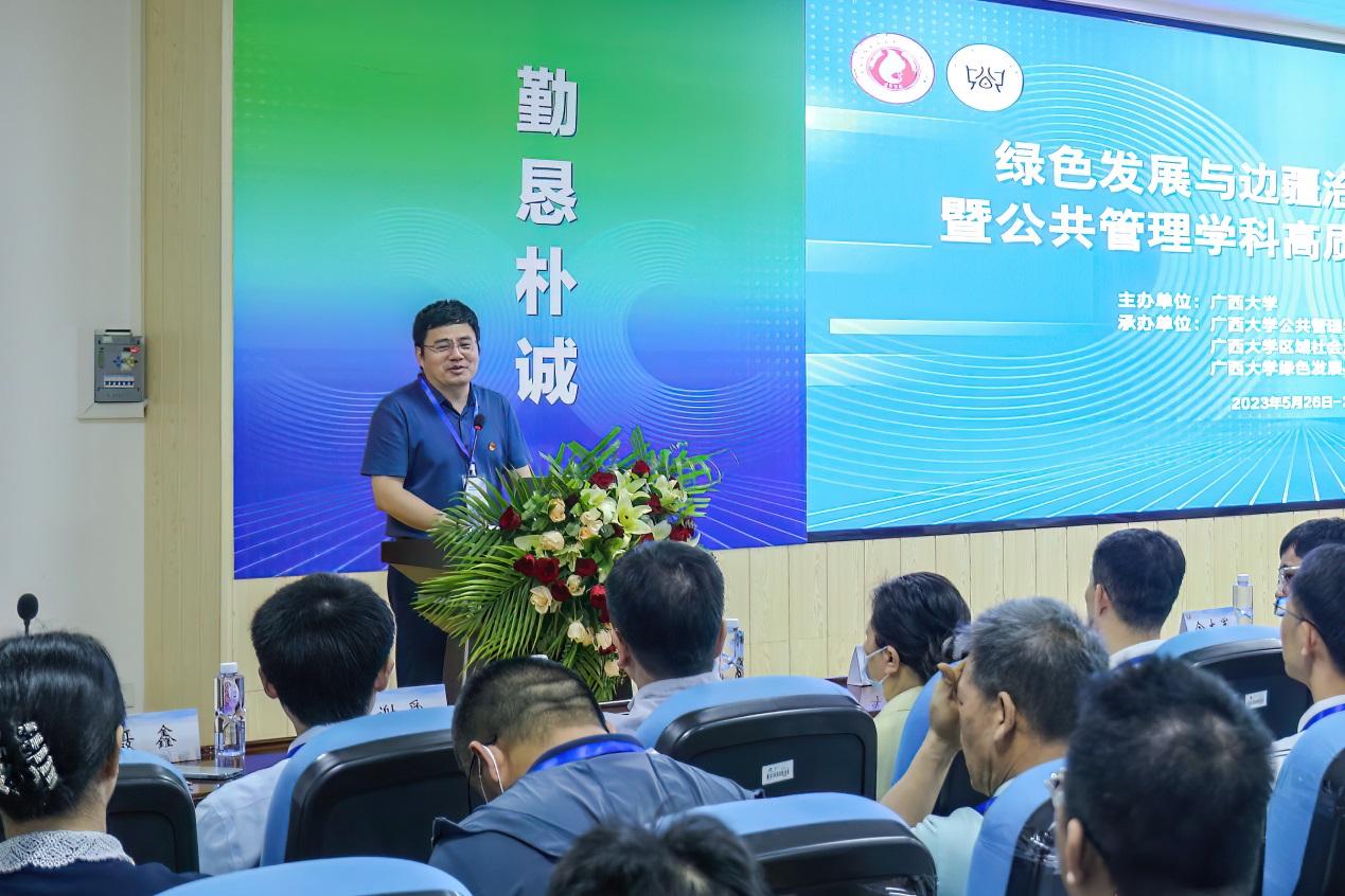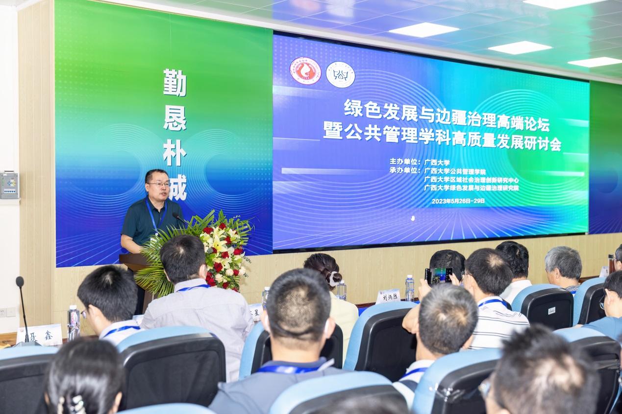 范祚军代表约啪社区 对论坛的召开表示祝贺,并指出,绿色发展与边疆治理一直是哲学社会科学研究的热点、重点和难点问题。在全国上下深入开展学习贯彻习近平新时代中国特色社会主义思想主题教育之际,约啪社区 举办绿色发展与边疆治理高端论坛是深入贯彻习近平总书记对广西“五个更大”重要要求、视察广西“4·27”重要讲话和对广西工作系列重要指示精神的会议,约啪社区 将全面贯彻中央和自治区关于发展绿色发展和边疆治理的指示精神,为边疆开放发展、新时代广西开放型经济发展继续提供智力支持与人才支撑。约啪社区 聚焦“绿色”“民族”“边疆”问题研究,科研成果显著,学院整体建设水平实现跨越式发展,希望学院以此次高端论坛为契机,继续探索“边疆治理”的绿色路径,为学校“双一流”建设和广西经济社会高质量发展贡献力量。