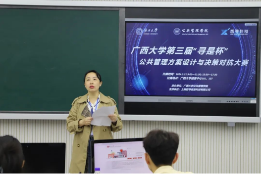 她指出此次大赛对于检验公共管理学科知识掌握程度,锻炼管理思维,提升决策能力具有重要作用,希望各位参赛选手重视比赛,恪守公平公正原则,赛出水平和风采。