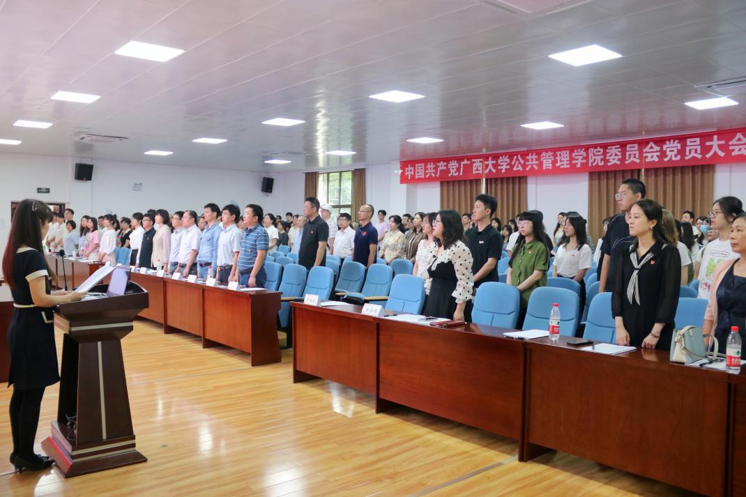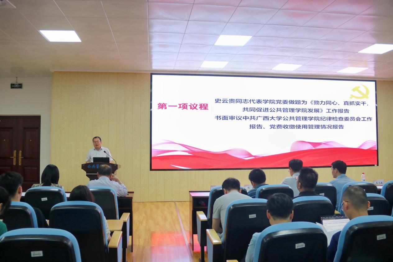 大会在国歌声中拉开帷幕。院党委副书记、院长史云贵代表学院党委作题为《勠力同心、真抓实干,共同促进约啪社区 发展》的报告,报告从基层党建、学科建设、人才培养、科学研究等方面全面回顾学院党委过去五年的工作。五年来,学院党委紧紧围绕学校中心工作,加快推进学院和学科高质量发展。学院获批首批新时代广西高校党建工作标杆院系,基层党建“作业本”运行机制获得学校和自治区主管部门的高度认可;在院系结构上,打造了“四系-两院-一中心”的学院治理结构;在学科特色品牌建设上,打造了西大公共管理学科的“绿色”品牌,在学界具有了一定的影响力。