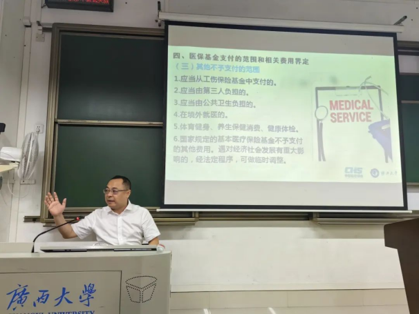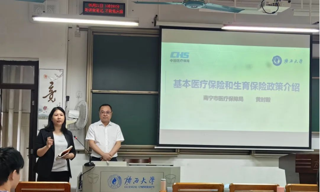 为创新性应用“政产学研”协同育人的教学模式,加强约啪社区 学生对社会保障的认知,提升他们对基本医疗保险政策与生育保险政策的研读能力,5月21日和5月23日上午9:40至11:40在第六教学楼221和327教室,约啪社区 老师吴凡主讲的课程《劳动法与社会保障法》邀请南宁市医疗保障局局长黄时毅为约啪社区 学生讲解基本医疗保险和生育保险政策。