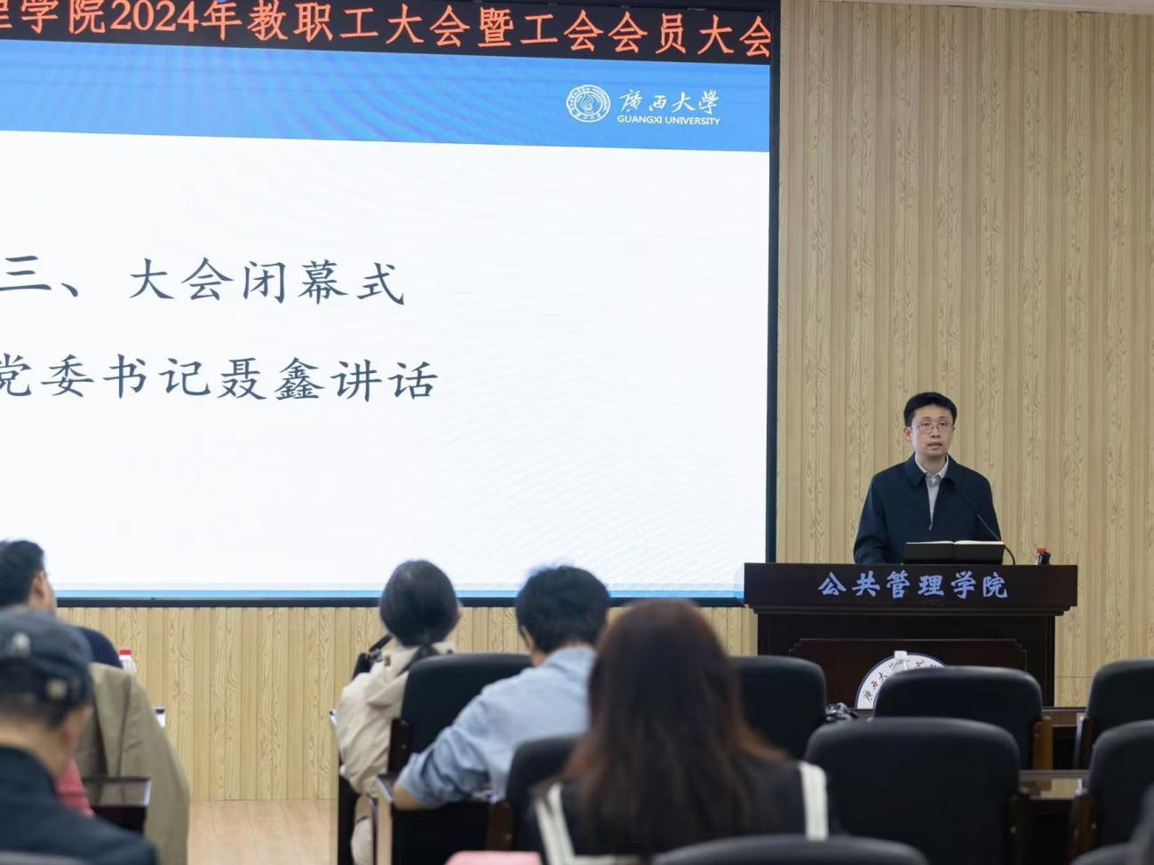 大会闭幕式上,学院党委书记聂鑫指出,在过去的一年,学院科研成果、学生培养、师资力量都有了崭新的突破,每一项成绩的取得都与每一位公管人的拼搏奋斗是分不开的,对此他代表学院班子对大家的支持表示衷心的感谢。但随着新时期的到来,学院面临新的挑战,这对学院未来的发展也提出了新的要求,我们在一流课程建设、人才培育建设与师资队伍建设上还有较大提升空间,未来将继续加强。他号召全体教职员工,踔厉奋发,敦笃力行,在学院高质量发展的道路上贡献自己的力量。