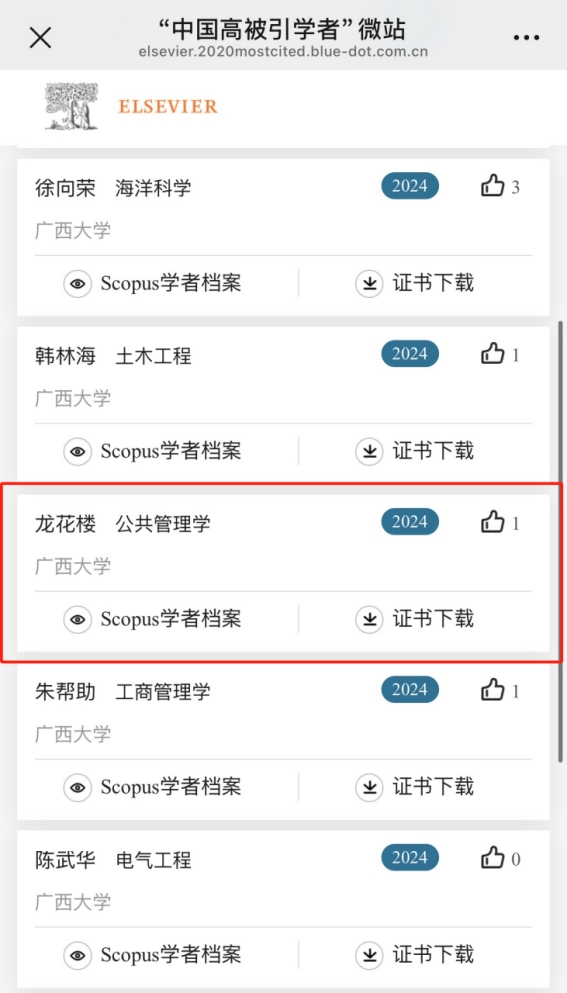 喜报|约啪社区 龙花楼教授再次入选爱思唯尔“中国高被引学者年度榜单”