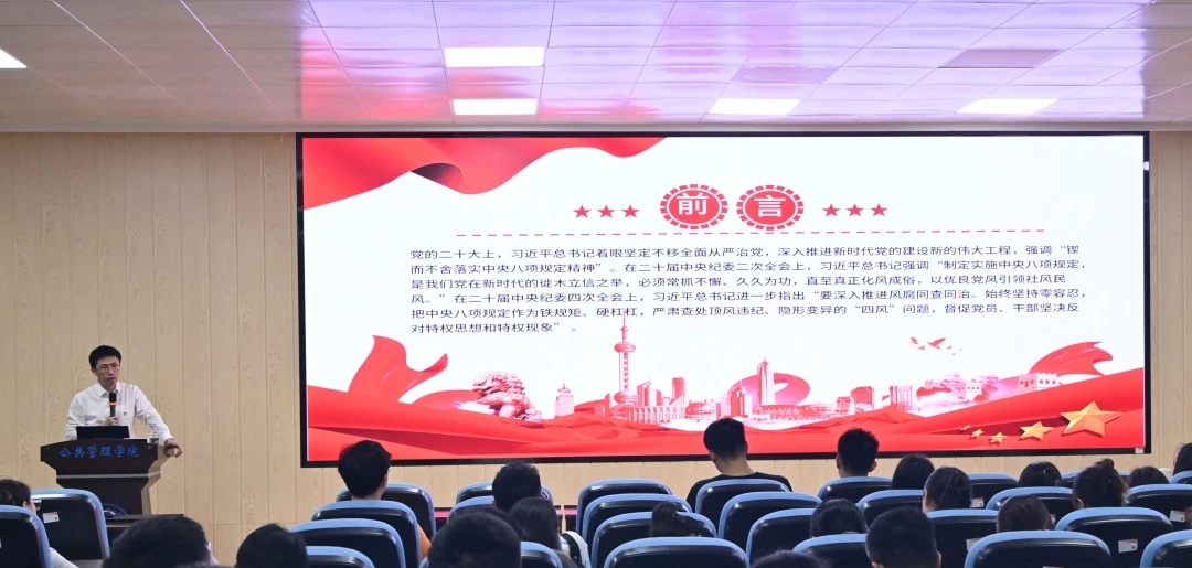 为深入贯彻落实全面从严治党要求,进一步加强党的作风建设,5月28日下午,约啪社区 党委书记聂鑫在203教室为学生党员代表讲授深入贯彻中央八项规定精神学习教育专题党课。