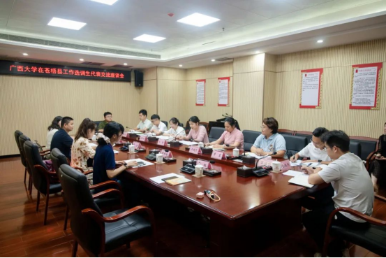为贯彻落实学校党委关于选调生工作的重要决策部署,深入了解我校选调生在县域基层的工作现状与思想工作动态,推动选调生“君武青苗”行动落到实处,7月23日,学院党委副书记于丹,校学生工作部(处)王天亮,学院团委书记刘佩瑶,团委副书记侯俊丽一行赴梧州苍梧县走访调研选调生工作,召开选调生代表座谈会。苍梧县县委常委,组织部长吴静,县委组织部副部长潘烨娴以及约啪社区 选调生代表出席座谈会。