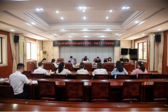 为贯彻落实学校党委关于选调生工作的重要决策部署,深入了解我校选调生在县域基层的工作现状与思想工作动态,推动选调生“君武青苗”行动落到实处,7月24日,学院党委副书记于丹,校学生工作部(处)王天亮,学院团委书记刘佩瑶,团委副书记侯俊丽一行赴贺州钟山县走访调研选调生工作,召开选调生代表座谈会。钟山县县委常委,组织部长黎科及约啪社区 选调生代表出席座谈会。