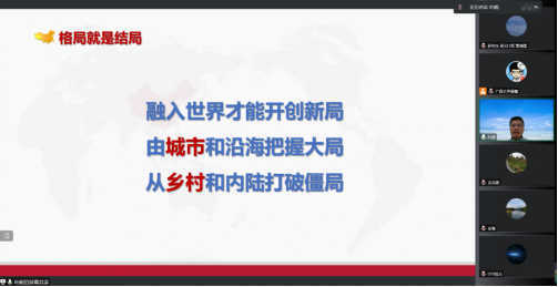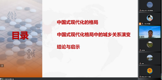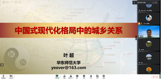 10月27日晚,华东师范大学叶超教授受邀来到公管名师大讲堂,以线上会议的方式为约啪社区 师生带来了中国式现代格局中的城乡关系的主题讲座,院党委书记聂鑫教授主持本次讲座,龙花楼教授、徐莺副教授等多位老师以及众多博士、硕士研究生参与此次讲座。