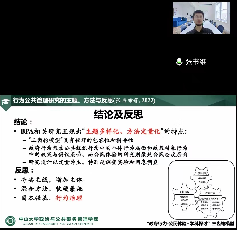 讲座伊始,聂鑫教授介绍了张书维教授的学术履历和研究方向,并对张教授的到来表示热烈的欢迎和感谢。张书维教授首先以垃圾分类中管制型政策和激励性政策引入主题,分别从行为治理概念、助力和助推工具、理论应用、讨论和小结五个部分展开今晚的讲座。张教授对行为公共管理学(BPA)进行追根溯源,并对BPA进行了理论界定,他认为BPA是公共管理学与心理学的交叉学科,采用科学方法对公共管理现象与心理过程的共有部分进行研究,并介绍了行为公共政策(BPP)产生背景。而后介绍了行为公共管理研究的论文发表数量,借鉴Grimmelikhuijsen等人(2017)的筛选规则,经筛选共获得320篇SSCI/CSSCI期刊文献及JBPA专刊文献。从2016-2021年,该领域中文和英文文献数量连年增长,主要的发文期刊有JBPA、PAR、PA等等,他指出BPA的相关研究呈现出“主题多样化、方法定量化”的特点。张教授根据研究主题介绍了“政府行为-公民体验+学科探讨”三齿轮模型,并认为此模型具有较好的包容性和指导性。