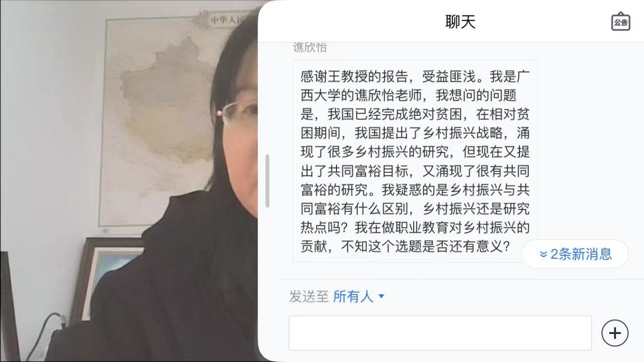 最后,王教授与参与讲座的师生开展了线上互动,详细解答师生提出的问题。魏副院长对王教授的精彩讲座致以诚挚的感谢,并邀请王教授到约啪社区 与西大的师生做面对面的交流。本次学术讲座让师生们更加了解国内外的贫困研究状况,激发了老师们申请国家社科基金的热情,引起了同学们对我国贫困问题的思考和重视,增强了大家的民族使命感和爱国情怀。