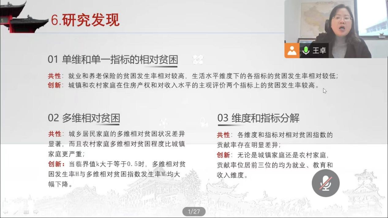 其次,王教授展示了她在贫困类型学视野下对相对贫困进行研究的成果,通过A-F多维贫困测度法研究发现,在单维和单一指标的相对贫困具有就业和养老保险的贫困发生率相对较高的共性,在多维相对贫困具有城乡居民家庭的多维相对贫困状态差异显著的共性。随后,王教授依照国家社科基金项目性质与类型、申请时间、申请书撰写、评审与立项、中期管理与结项、其他注意事项等方面分享了她在做国家社科基金项目研究的体会。