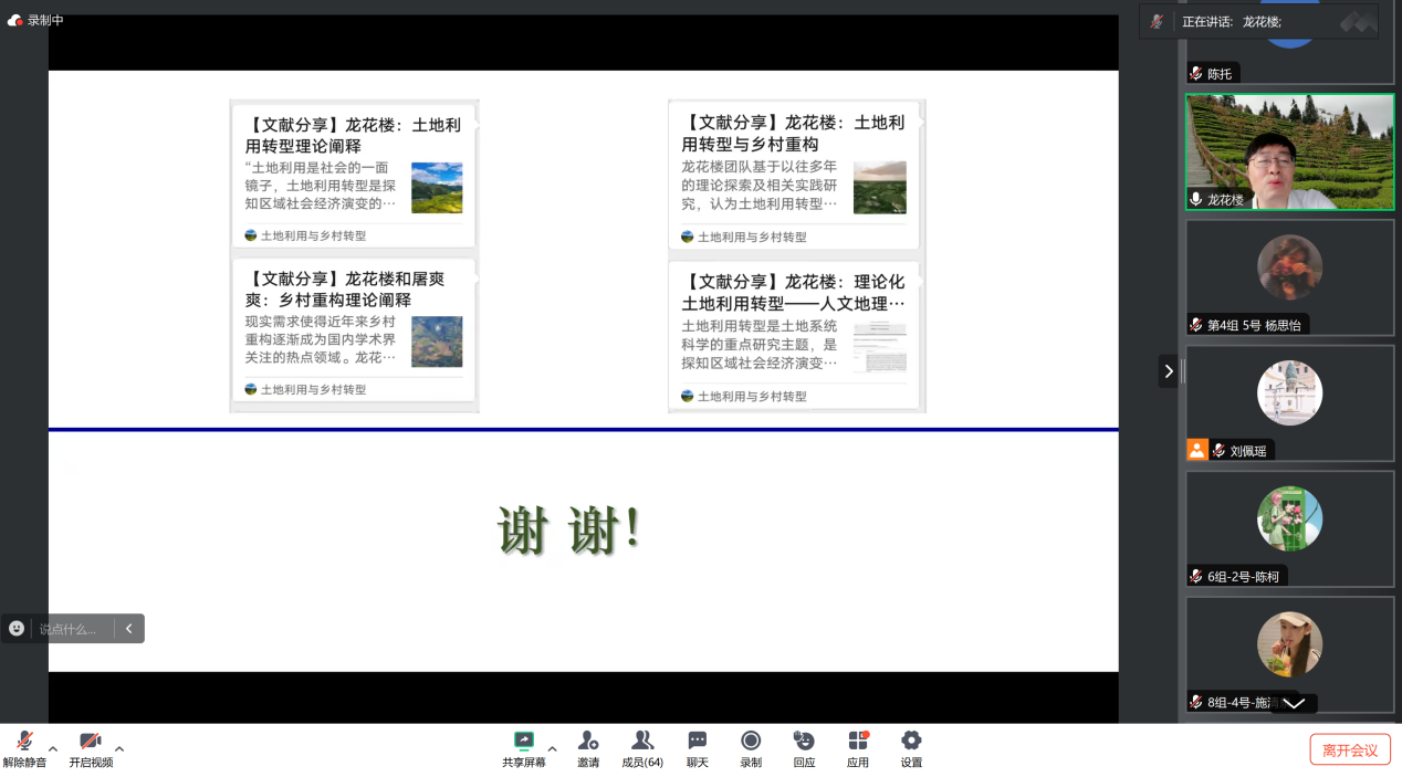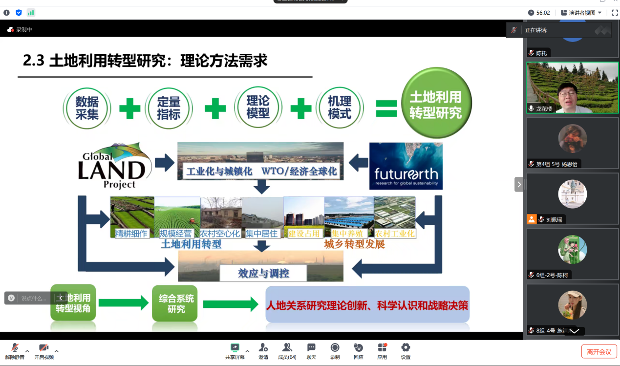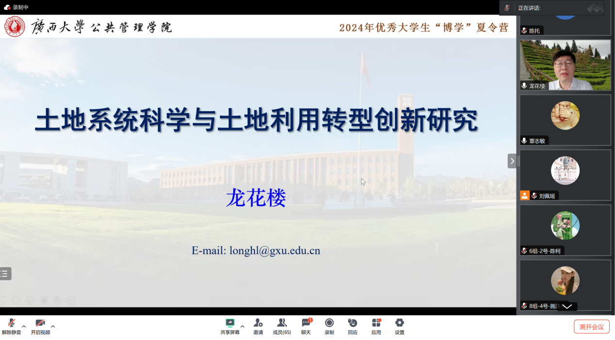 7月10日上午,约啪社区 教授龙花楼老师以线上形式作主题为“土地系统科学与土地利用转型创新研究”的学术讲座。本次讲座是约啪社区 2024年“博学”优秀大学生夏令营的环节之一,由约啪社区 副院长覃志敏主持,六十余名“博学”夏令营营员参与其中。
