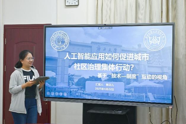 郭贝儿同学进行了题为《制度设计视角下人工智能的应用促进城市社区治理集体行动的机制研究》的分享。她指出人工智能广泛应用且逐渐渗透至社会治理各方面,在城市社区治理中应用效果存在不确定性,并且学界对其影响社区治理集体行动的具体机制缺乏系统研究。郭贝儿基于“技术—制度”互动的视角提出了两个研究问题,第一,人工智能的应用对城市居民参与社区治理集体行动会产生怎样的影响?第二,制度创新是否会引导居民技术应用行为改变进而影响社区治理集体行动?她通过构建回归检验模型进行研究分析,明确了核心自变量为居民对人工智能的应用水平,因变量为城市社区治理集体行动水平等。郭贝儿表示虽然当前研究推进中存在问卷设计及人工智能应用场景界定等难点,但为后续探索人工智能在城市社区治理中的作用机制奠定了基础。