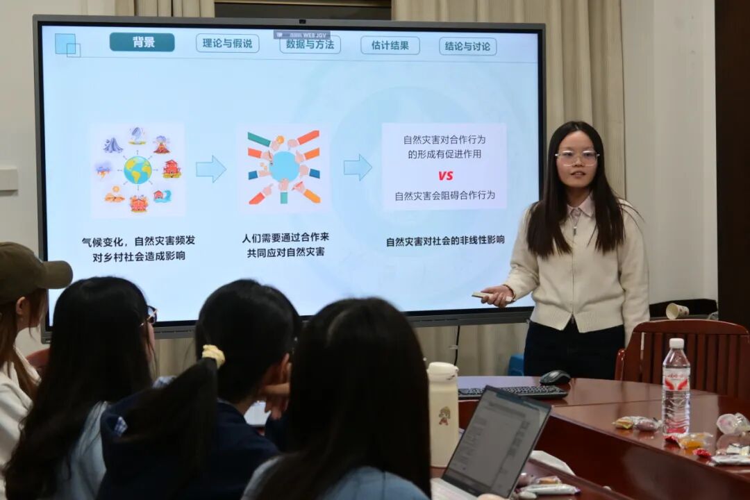 曾群棋同学则围绕《自然灾害对集体行动的非线性影响——基于中国边疆地区的证据》展开分享。她依托约啪社区 2023年边疆地区“百村千户”调查数据,运用组合IAD-SES框架,重点剖析自然灾害与集体行动的内在关联,并提出二者存在“倒U型”非线性关系的核心观点:中小灾害可成为打破村庄僵化结构的“机会之窗”,通过推动资源重组与社会学习提升集体行动水平;而大规模灾害则会因资源耗竭、社会网络破坏,导致系统陷入“贫困陷阱”,进而抑制集体行动。为进一步验证该结论,她将集体行动划分为预防型和应对型两类,通过工具变量法及系列稳健性检验,充分证实了这一非线性关系的稳定性,并基于此提出分等级灾害治理的针对性政策建议。