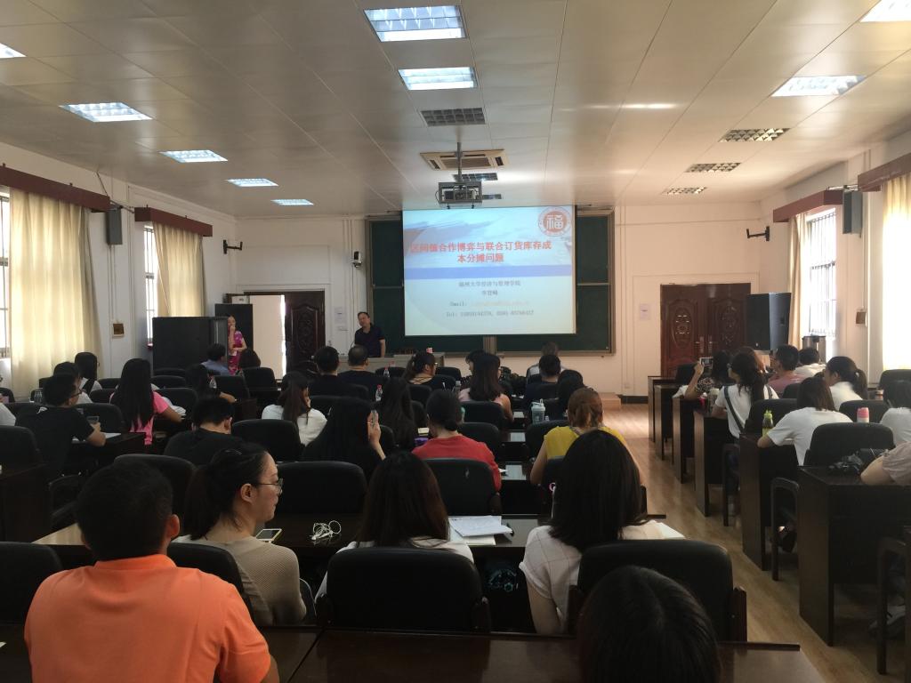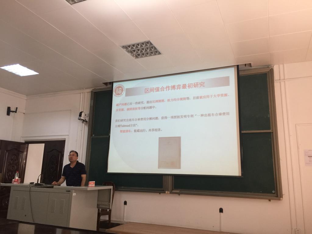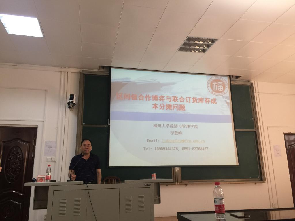 5月27上午10时,福州大学经济与管理学院教授李登峰于约啪社区 107学术报告厅开展主题为“区间值合作博弈与联合订货库存成本分摊问题”的学术讲座。讲座由约啪社区 汪晗副教授主持,数信学院刘芳教授、约啪社区 聂鑫教授和约啪社区 众多研究生参加了本次讲座。