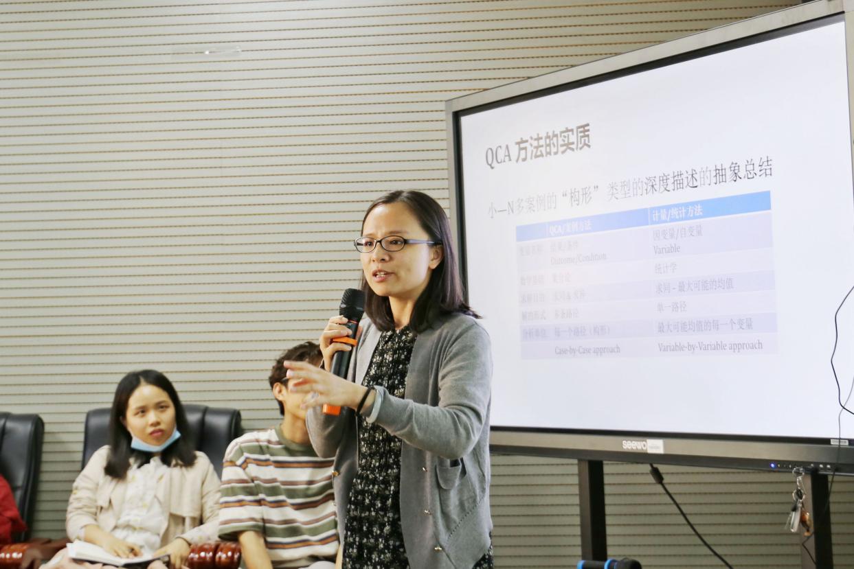 张明慧老师曾运用QCA方法发表过SSCI的论文,因此她跟同学们分享了自身写作经历和对QCA方法的认识,向大家介绍了QCA方法和传统的统计方法的不同。首先,她跟同学们展示了现有的在知网、C刊以及社科上有的基于QCA方法写作的文章数量。她指出,QCA方法在国内逐渐得到了认可、推广和应用,并简要阐明何为QCA方法的清晰集和模糊集的内涵。其次,她通过与计量方法进行比较,说明了QCA方法的实质,给出了“小-N”多案例的“构型”类型的深度描述的抽象总结。她还说明了QCA方法的操作步骤,包括过程、使用条件和对策。最后,她希望同学们能够认识到QCA方法的魅力,其思维是跟常规的统计分析方法是不一样的,求解的路径是可以有多种的。