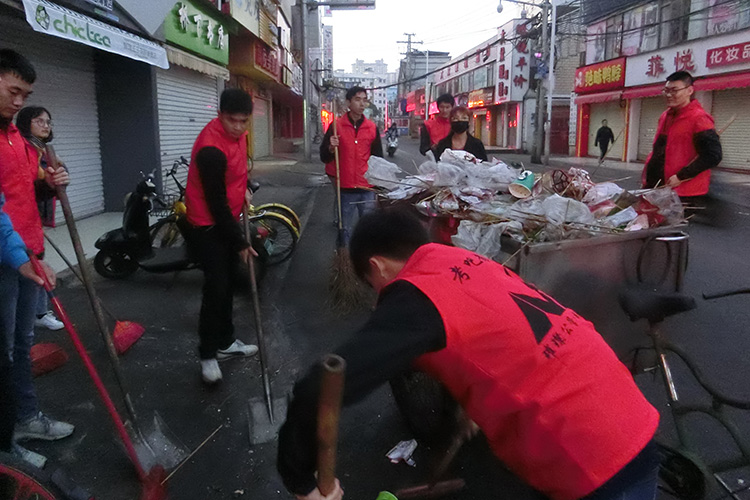 志愿者分为两批,清扫不同的区域。一些志愿者们生涩地拿着铲子将地上的垃圾铲入垃圾车,其他人便推着愈加沉重的垃圾车缓缓前行。环卫工人在一旁耐心的细心指导,工作井然有序地进行着。经过两个多小时的努力工作,志愿者和环卫工人们的额头上也早已挂上汗珠。天渐渐亮了,农院路也逐渐恢复了往日的干净整洁。