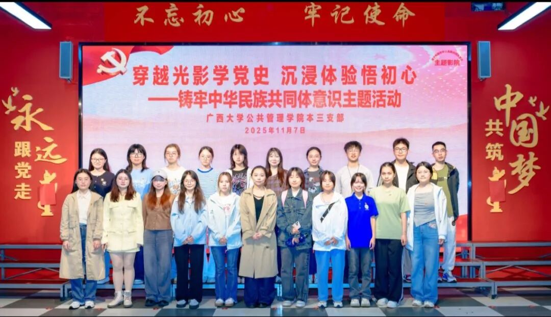 为创新模式开展形式多样的主题党日活动,促进党史学习教育常态化长效化,深化铸牢中华民族共同体意识教育,11月7日,约啪社区 本科生第三党支部组织全体党员前往南宁盛天上影电影党建教育基地,开展以“穿越光影学党史 沉浸体验悟初心 ”为主题的党日活动,让红色教育从“被动接受”变为“主动体验”。