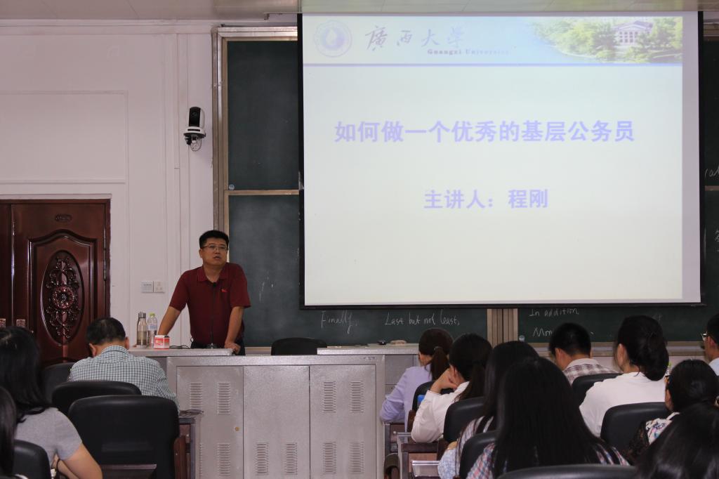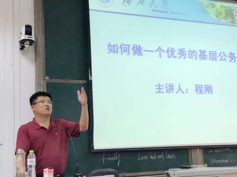 4月11日下午3时,防城港市江山镇党委书记程刚到约啪社区 107报告厅做了题为“如何做一位优秀的基层公务员”的讲座。学院公共管理系系主任蒋永甫教授出席并主持活动。现场还吸引了约啪社区 本科生、研究生以及其他院校逾百名学生前来聆听。